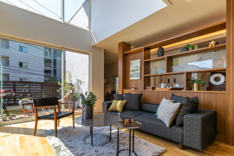 積水ハウス木造住宅「シャーウッド構法」の3階建て住宅。2500mm天井までのクリビューサッシ、出隅コーナーサッシの採用で明るく開放的な展示場です。