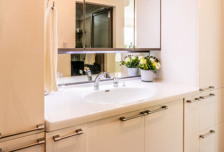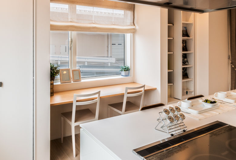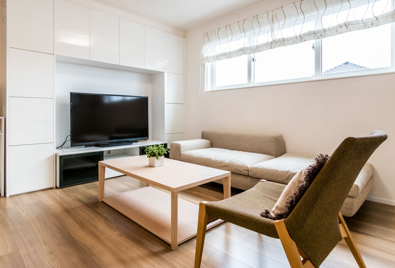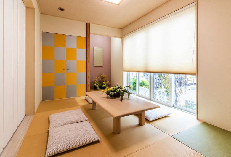 白やグレーの家具でまとめられた明るくモダンな1階。2階は、濃い木目やベージュの家具で落ち着きのある空間を演出しました。和室には、黄色の市松模様の押入れと落ち着いたピンクの壁紙の床の間があり、遊び心のある色遣いで空間にアクセントをプラスしています。また、シューズクロークや備え付けの本棚、キッチンパントリーなど、家じゅうに十分な収納を計画し、必要な時に必要なものが取り出せるよう工夫しています。いつもスッキリとした部屋を保つことができ、毎日の使いやすい収納として大活躍です。