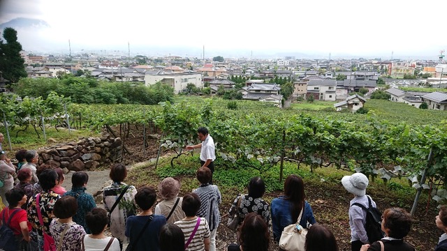 まず、バスツアーで最初に訪れるのは、山梨県石和市にある日本一小さなワイナリー『ドメーヌQ』です。ここでは直営レストラン『ボルドー』で出すワインを自家製で作っています。日本では栽培が難しいと言われた品種、ピノ・ノワールの葡萄畑は、日本最大級の栽培本数を誇ります。マスカットベリーAなどと絶妙に配合することによって、レストランで提供するステーキランチにマッチしたワインを醸造しているのです。