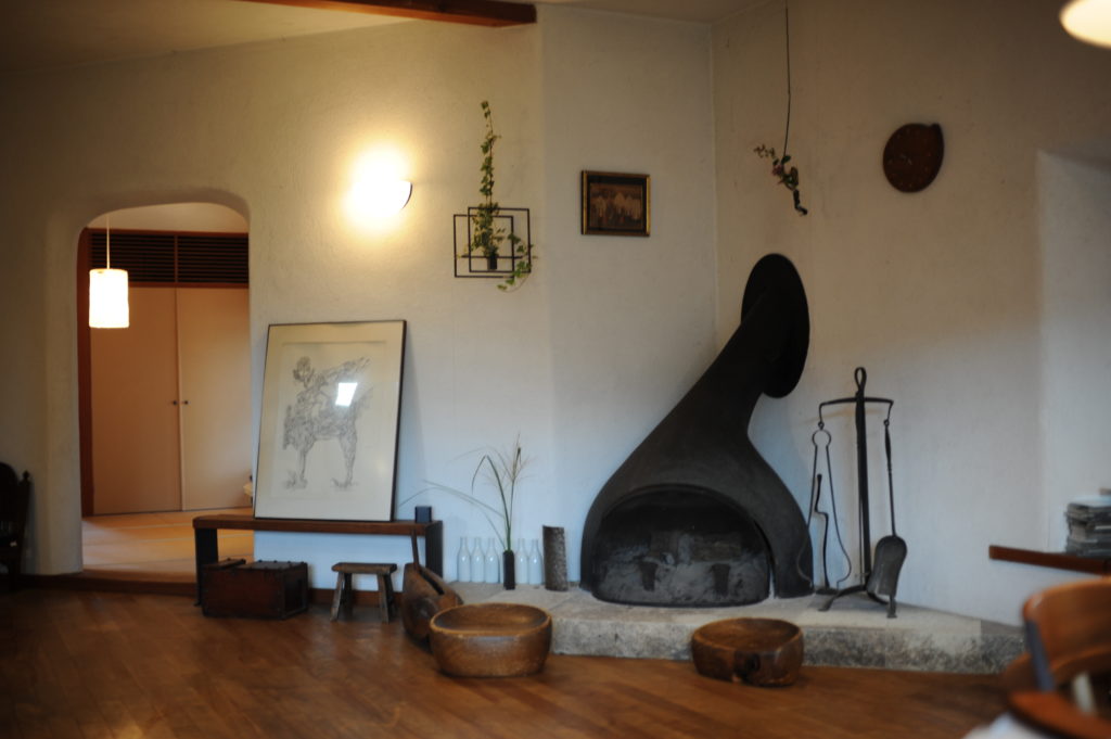柔らかな曲線が美しい暖炉。冬は近所の山から薪を拾ってきて暖をとる