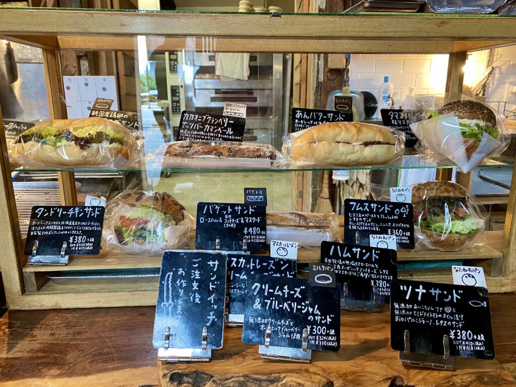 風土の魅力の一つが種類豊富なサンドイッチメニュー。「ひとりでやっているのでパン自体の種類が少ない分、バリエーションを増やすためでもあるんですが…。自宅でサンドイッチを作るときのレシピ紹介という位置づけもあります」。ショーケースに並ばないメニューは、オーダーを受けてから専任の女性スタッフが手際よく仕上げていきます。人気は、タンドリーチキンサンドとあんバターサンド。また、ビーガンメニューとして豆のフムスやピーナッツバターサンドも用意しています。