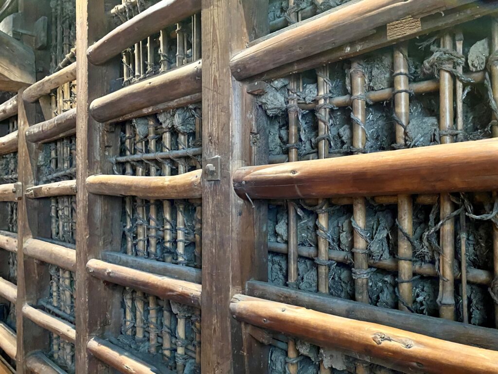 半割丸太を各柱間に横方向に入れ込んで荷摺木(にずりぎ)するという独特な工法の壁