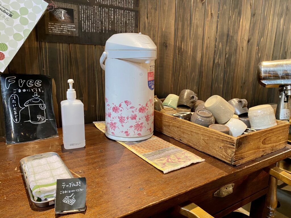 オーダードリンクのほかに冬はホット、夏は冷たい三年番茶のセルフサービスも