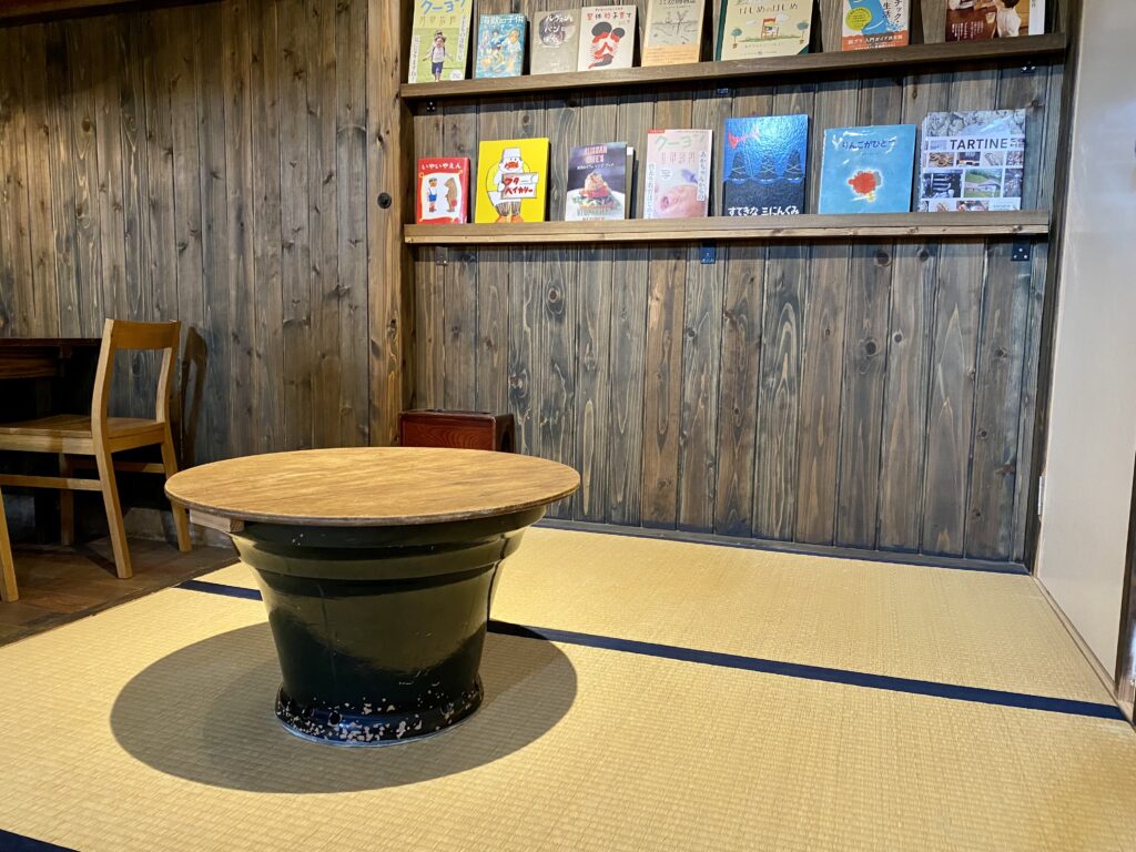 靴を脱いでくつろげる畳の小上がりスペース。絵本やパンに関する書籍もあります