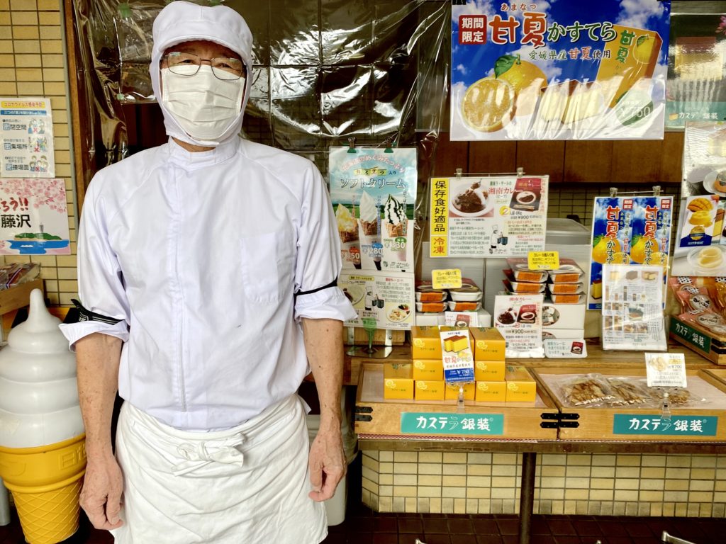 終始丁寧に案内してくださった筒井工場長、ありがとうございました。期間限定「甘夏カステラ」の前でパチリ!