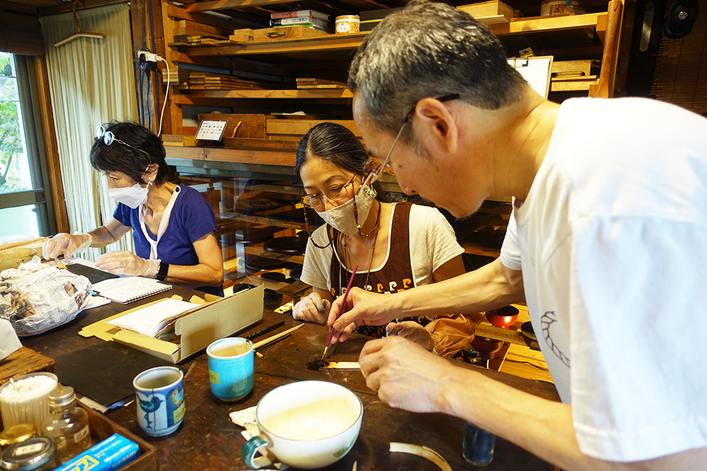 受講者自身が仕立てたヘラを使い、本漆を扱います。後藤さんは素手ですが、手がかぶれないよう受講者はビニール手袋をつけての作業。後藤さんのアドバイスにメモをとりながら、眼差しは真剣