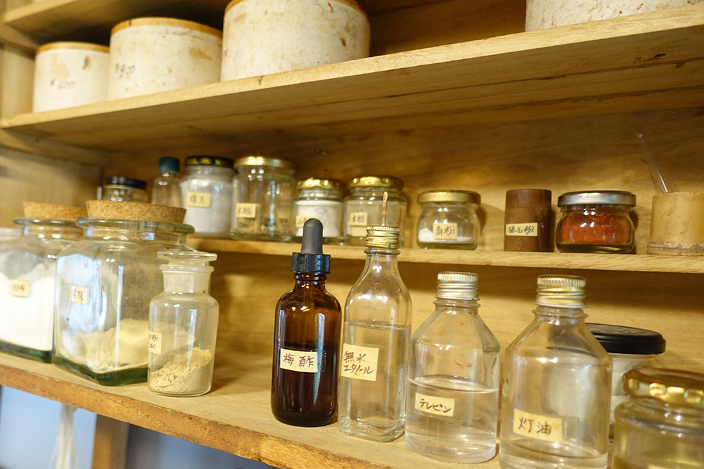 アトリエの棚には、料理で使うような梅酢や白玉粉、小麦粉なども陳列。古くから受け継がれる天然素材を用いた技法を大切にしています