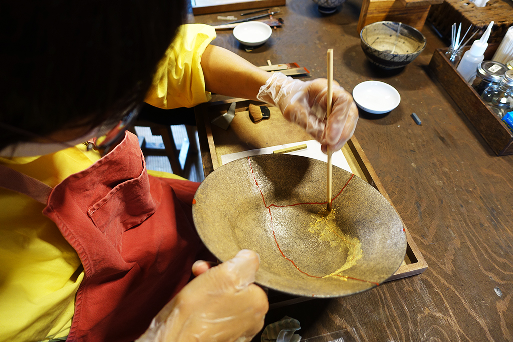改めて、金継ぎ教室開催のきっかけを伺うと、「鎌倉彫や漆器で欠かせない漆は、陶器や磁器などを修復する日本伝統の“金継ぎ”と通じるところがあります。数年前から創作活動の合間に、本漆を用いた教室を開くようになりました」と笑顔で。