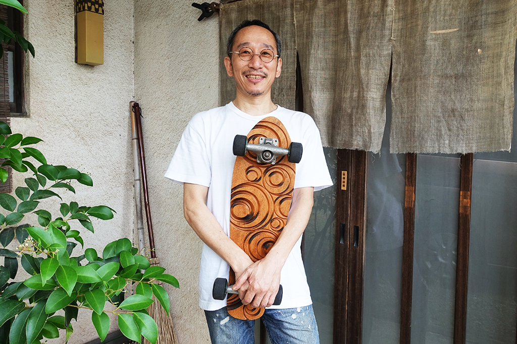 鎌倉彫の技法を用いて、実用品として製作したスケートボードを手にする後藤信治さん。2014年には鎌倉彫技能士を習得して活動の幅を広げています