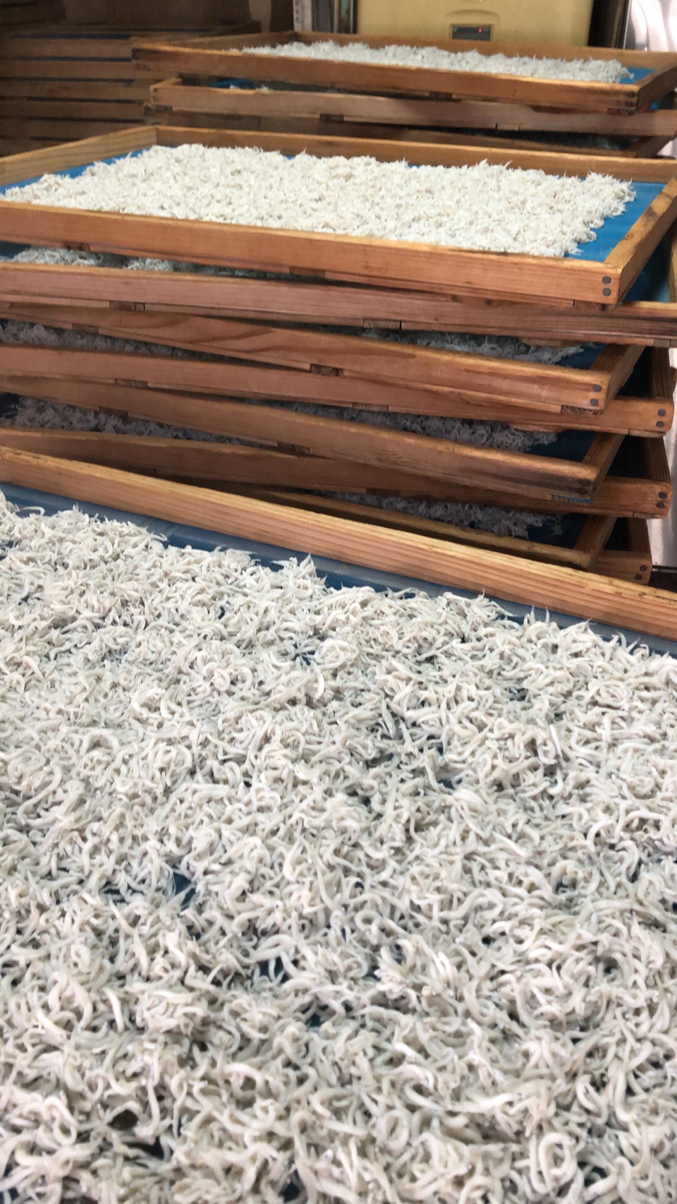 水を切ったシラスが木枠にあけられると、すばやくお箸で広げ、奥に積んでいきます。日によっては、この後ちりめんや、タタミイワシづくりを屋上でするそうです。