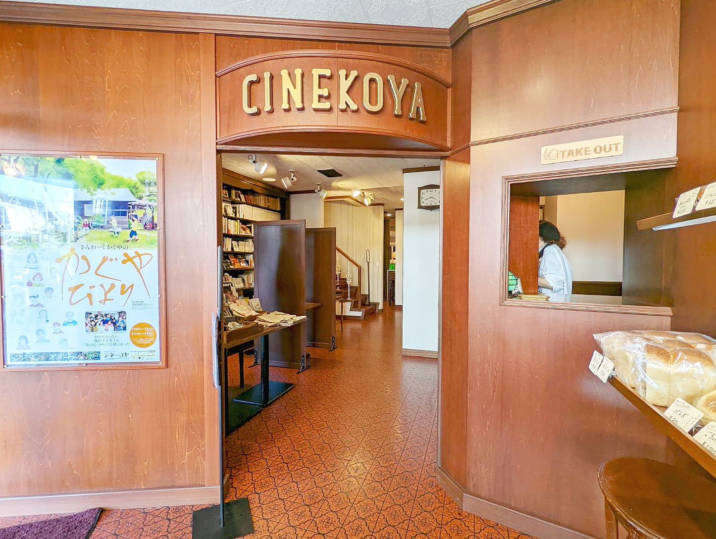 シネコヤの店内は、1階のエントランス部分に料金窓口とパンの売店、その奥にイートインスペースや図書室があります。