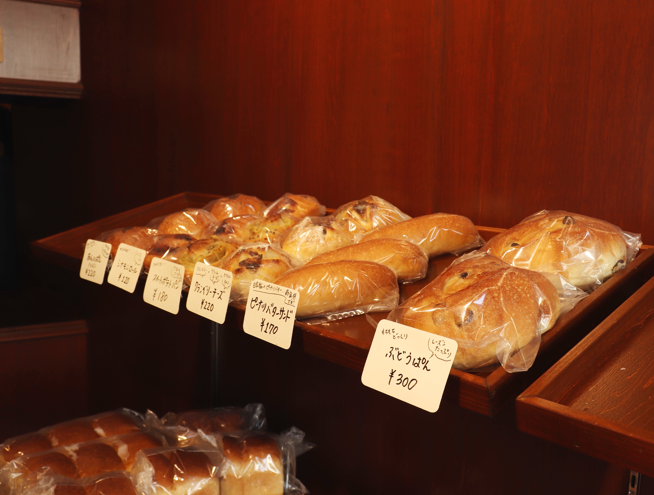 この日のラインナップは「食パン」や「バンズ」のお食事系パンのほか「ぶどうぱん」「ピーナツバターサンド」など