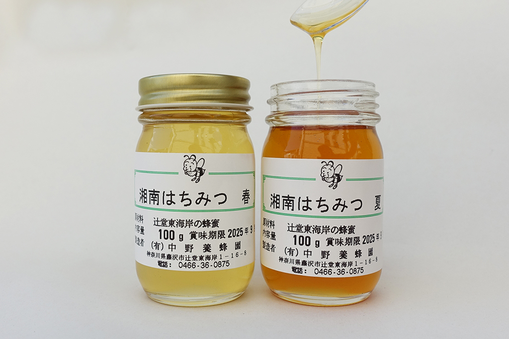 ふじさわ観光名産品に選ばれる「湘南はちみつ」。【春】(左/4~6月に採集)はさっぱりと食べやすく、【夏】(右/7~8月に採集)は春に比べて色味が濃く、コクのある味わい。 ※1歳未満の乳児には、ハチミツは与えないでください