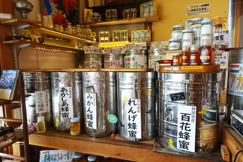そのほか店内には、国内外の産地や花の名前が書かれた大きなタンクがズラリ!ハチミツの季節や採集量に合わせて、合計12~13種類並びます。どれも風味が異なるため、用途ごとに使い分けたりする方もいるほど、味の違いは歴然のようです。