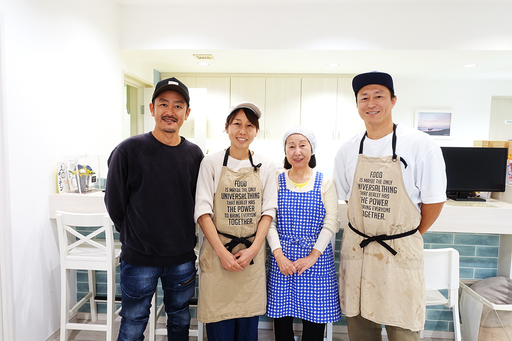 写真左から=湘南佐藤農園代表・佐藤智哉さん、妻の夏生さん、智哉さんのお母さん、スタッフの井上さん。この日は智哉さんのお母さんが、ピザ生地の仕込みを担当。厨房からピザの良い香りが広がります