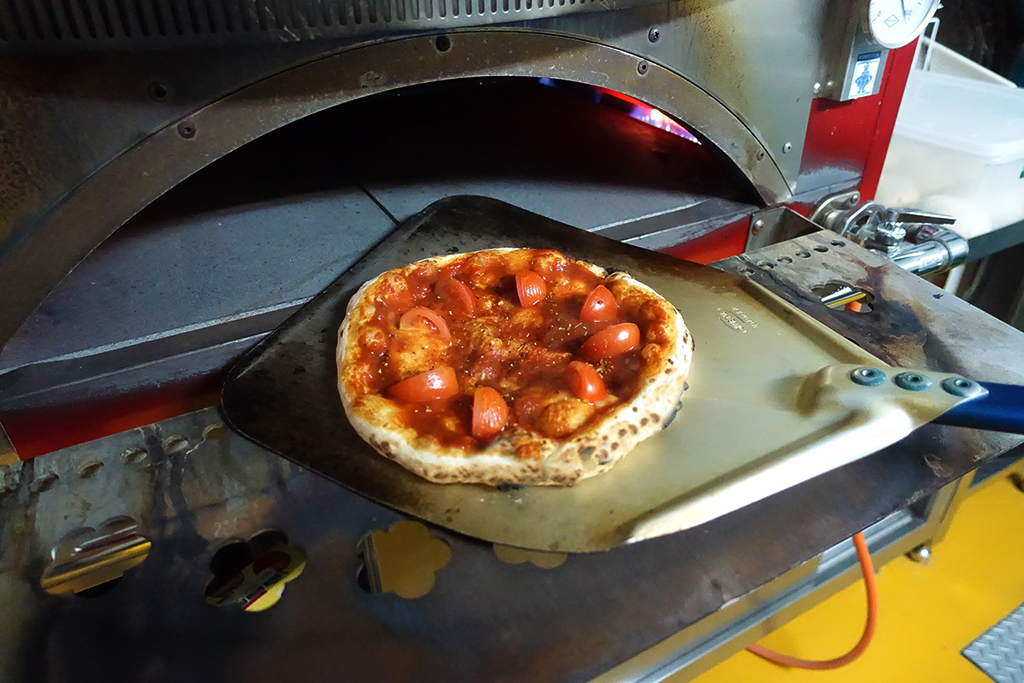 今回は10種類ほどあるピザから、フルーツトマトをたっぷりのせた「農園トマトのマリナーラ」を注文。18世紀にナポリの漁師が好んで食べたという“マリナーラ”は、トマトとニンニク、オレガノをトッピングしたシンプルなピザで、チーズがのっていないのも特徴。ひとくち食べると、フルーツトマトを使ったソースのコクとトッピングされたフレッシュトマトの甘味がジュワっとあふれ出し、皮も薄く口触りよく滑らかです。チーズがないのに満足感はしっかりとあり、これほどまでにマリナーラを引き立てるトマトはないのでは!?