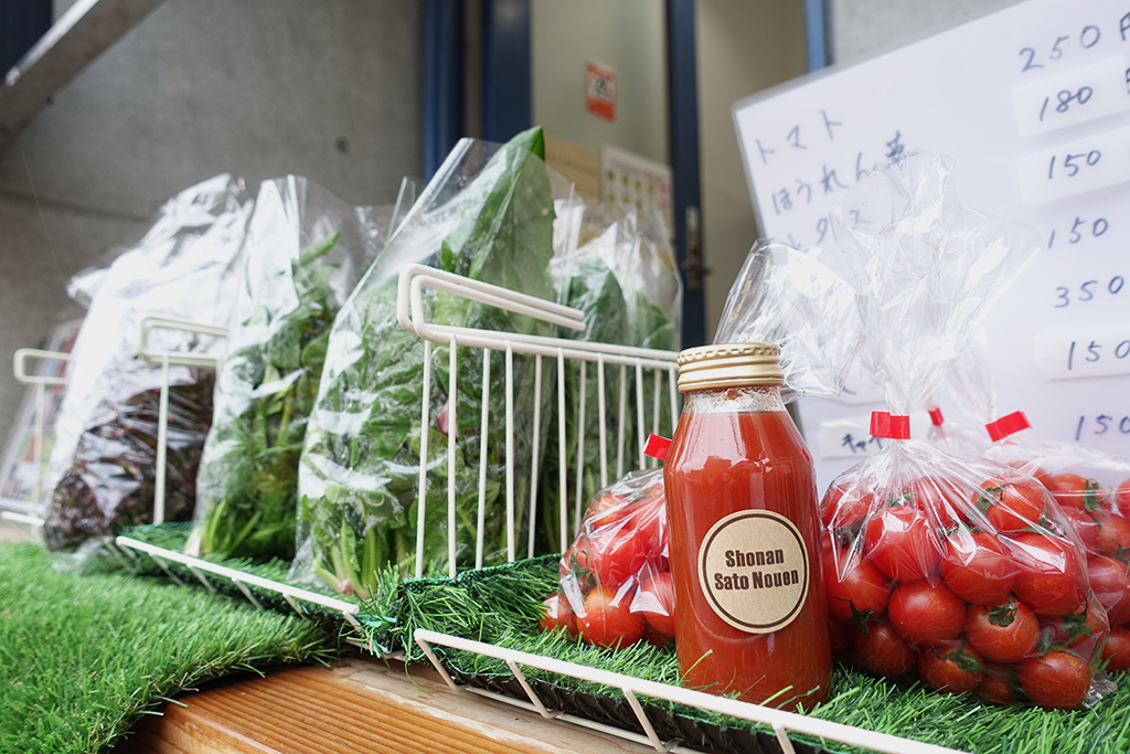 善行駅前にある「畑のキッチン」店頭には、佐藤さんの畑で採れた野菜やフルーツトマトを使った100%濃縮ジュースを販売。野菜の直売所感覚で立ち寄る方も多いそう