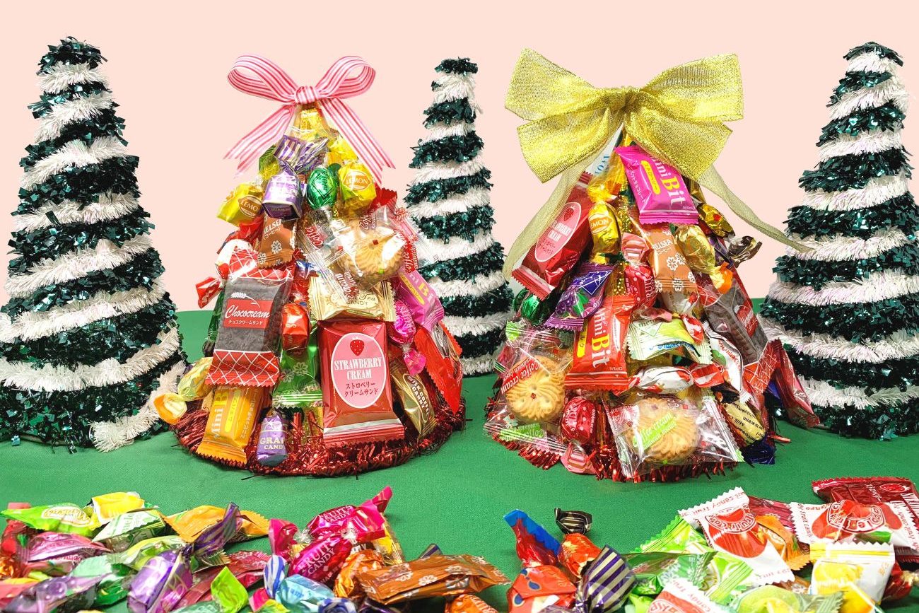 パーティーハットに好きなお菓子をいっぱい飾りつけて、クリスマスツリーを作ろう!