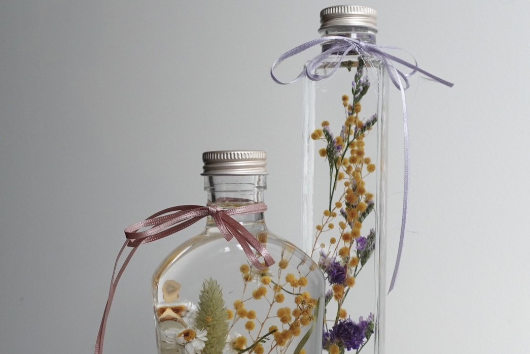 透明なボトルの中に、色とりどりの花材を自由にレイアウトしてつくる、世界に一つだけのオリジナル・ハーバリウム。