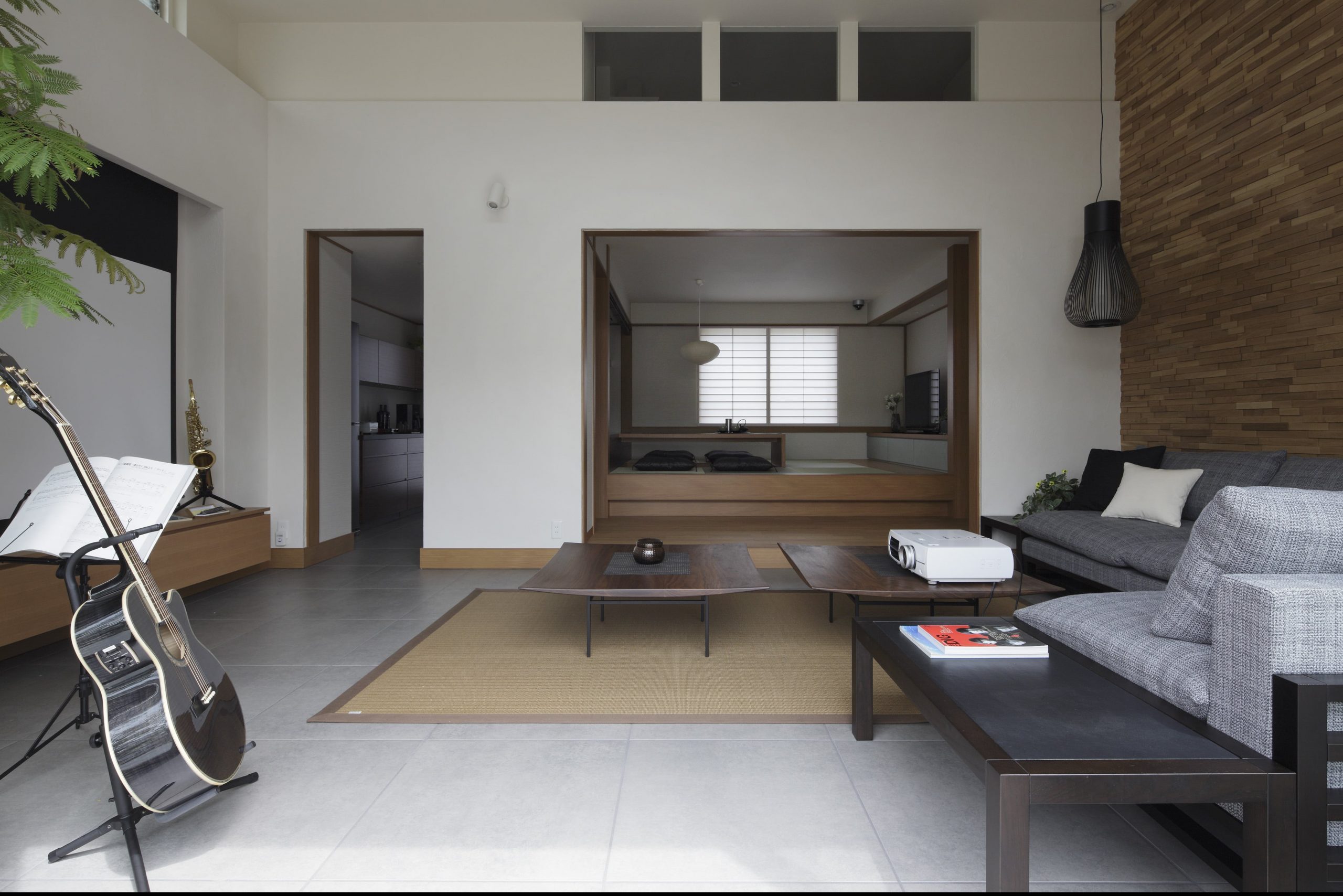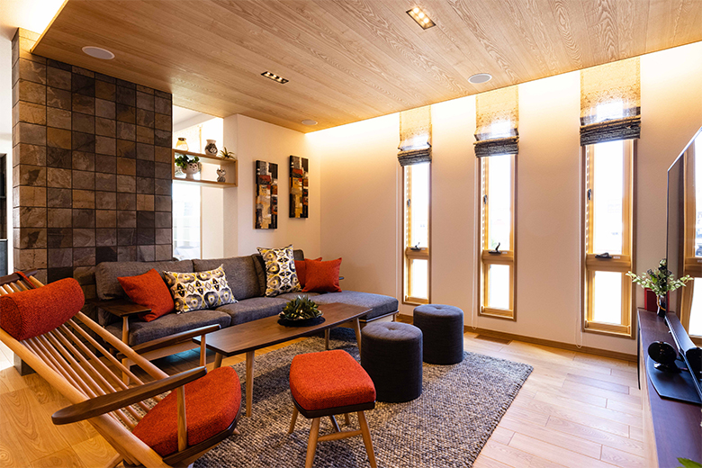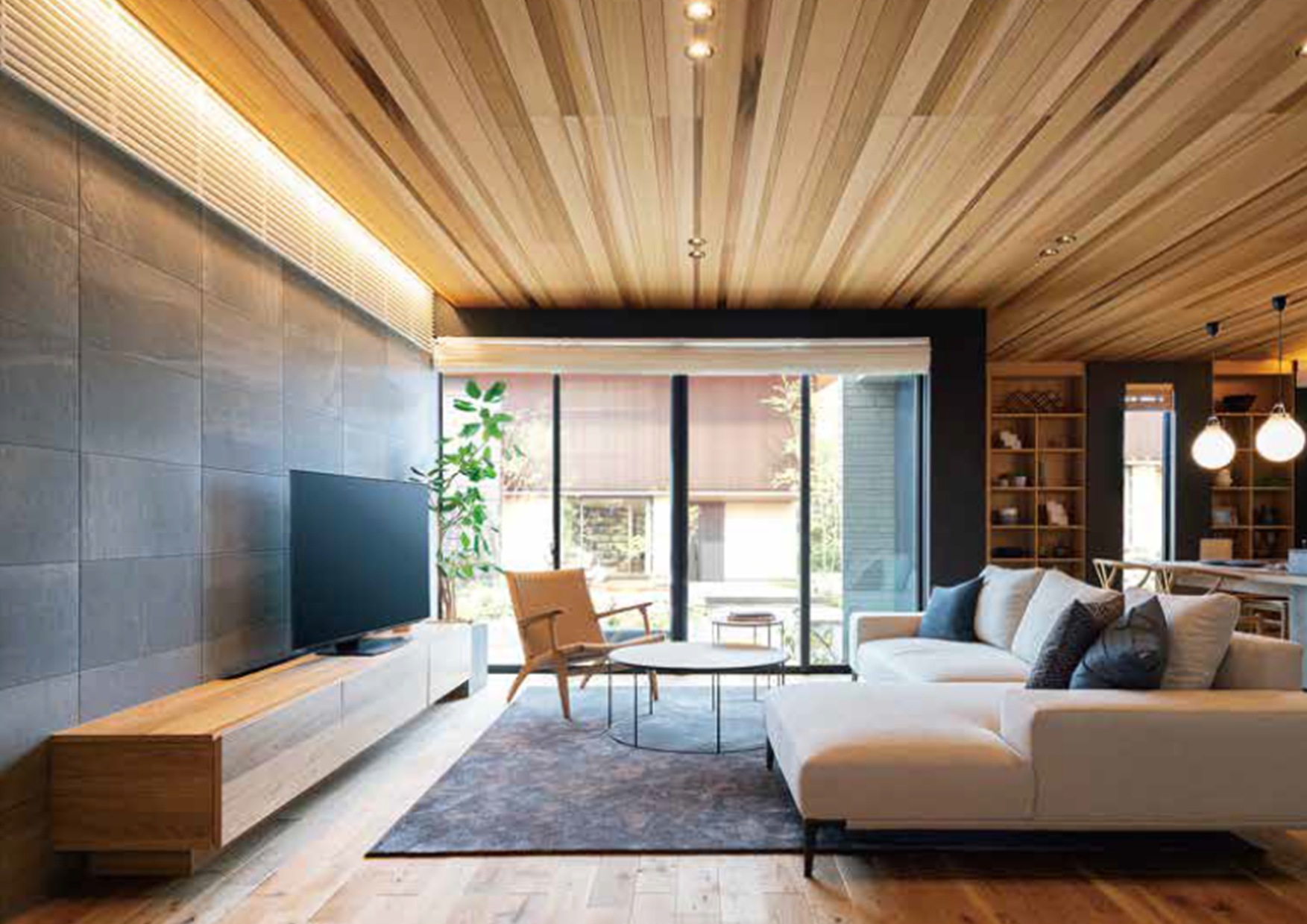 親世帯の1階リビングは、石目調タイルの壁や木パネルの天井など素材の質感が心地よい寛ぎの空間です。