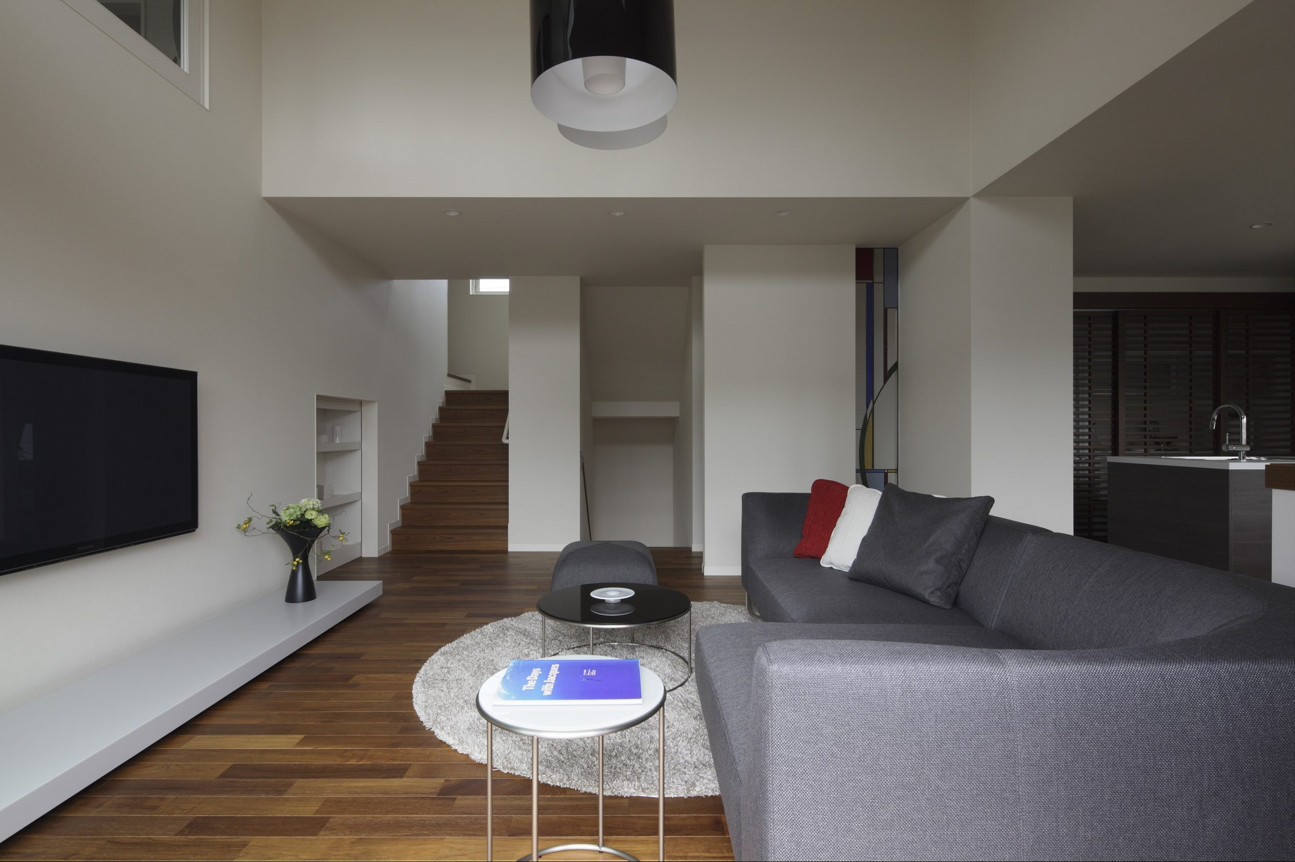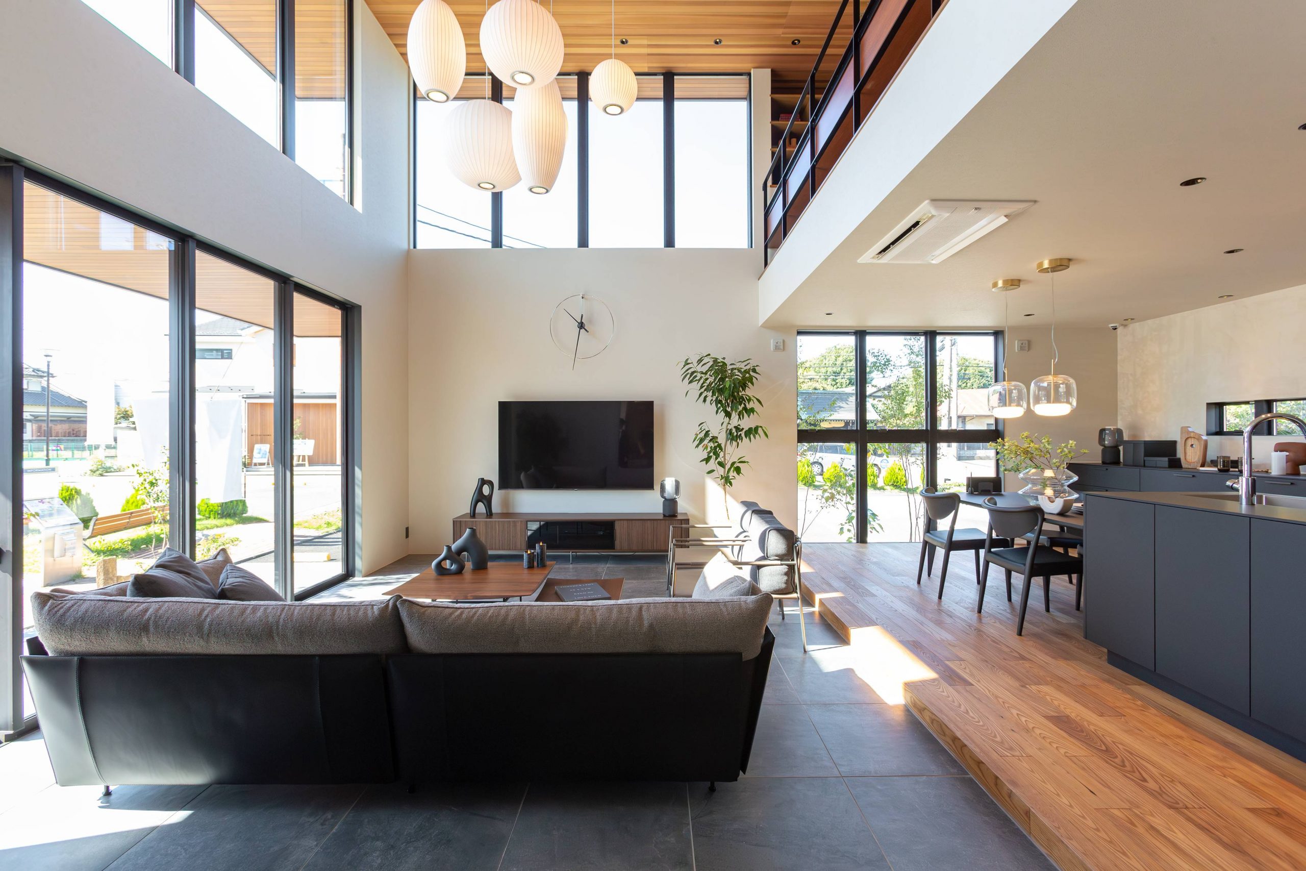 大空間のリビング。ソファーからの目線はあえて壁にし、大空間でありながらホッと落ち着ける空間を演出