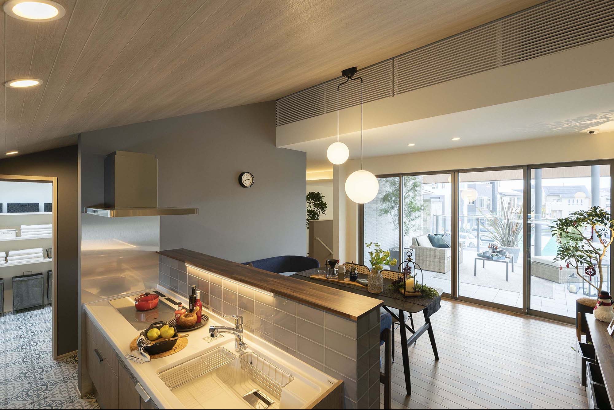家族が集う、家族がつながる、コミュニケーションキッチンを中心とした空間。使い勝手の良い家事動線も見所です。