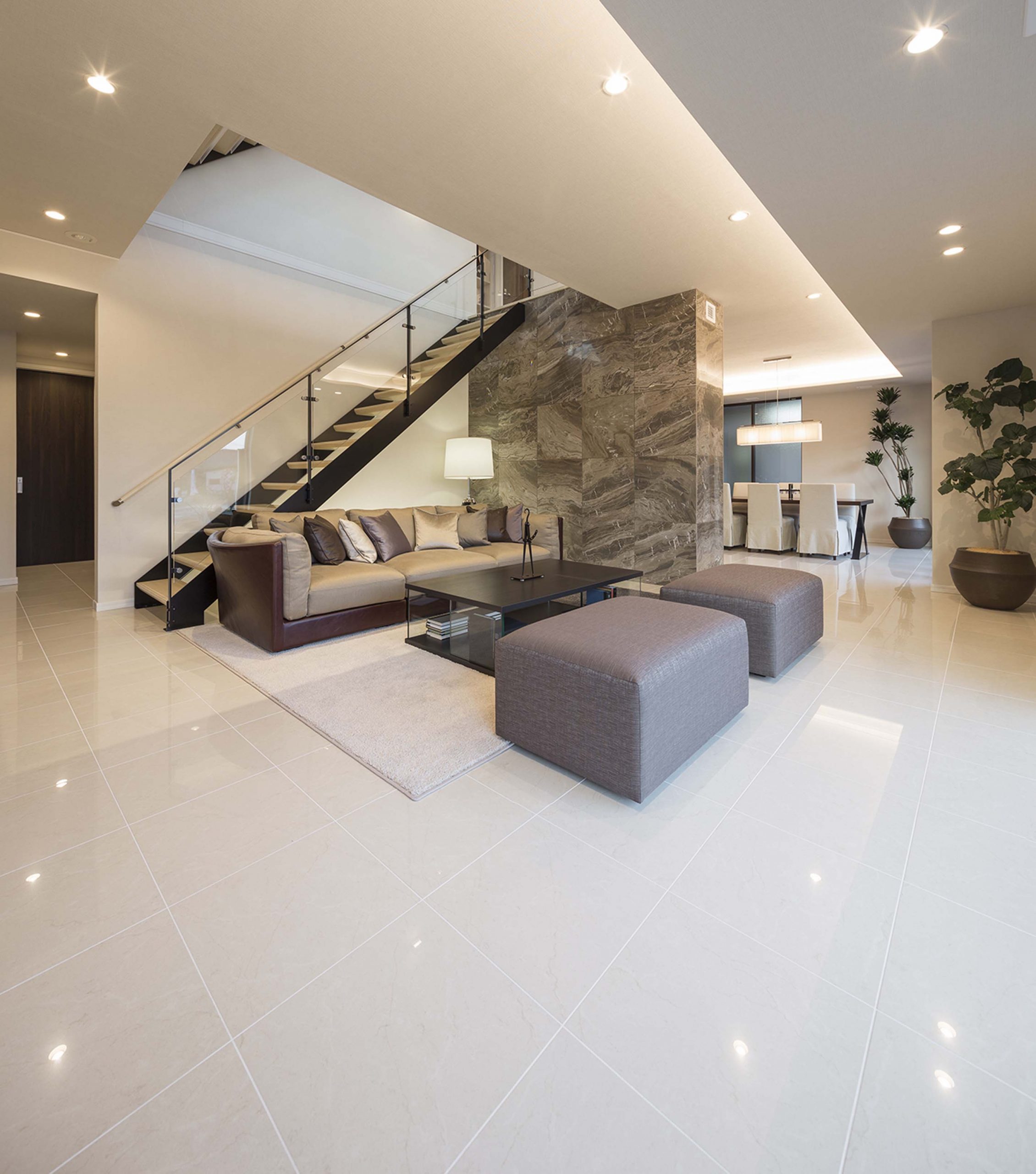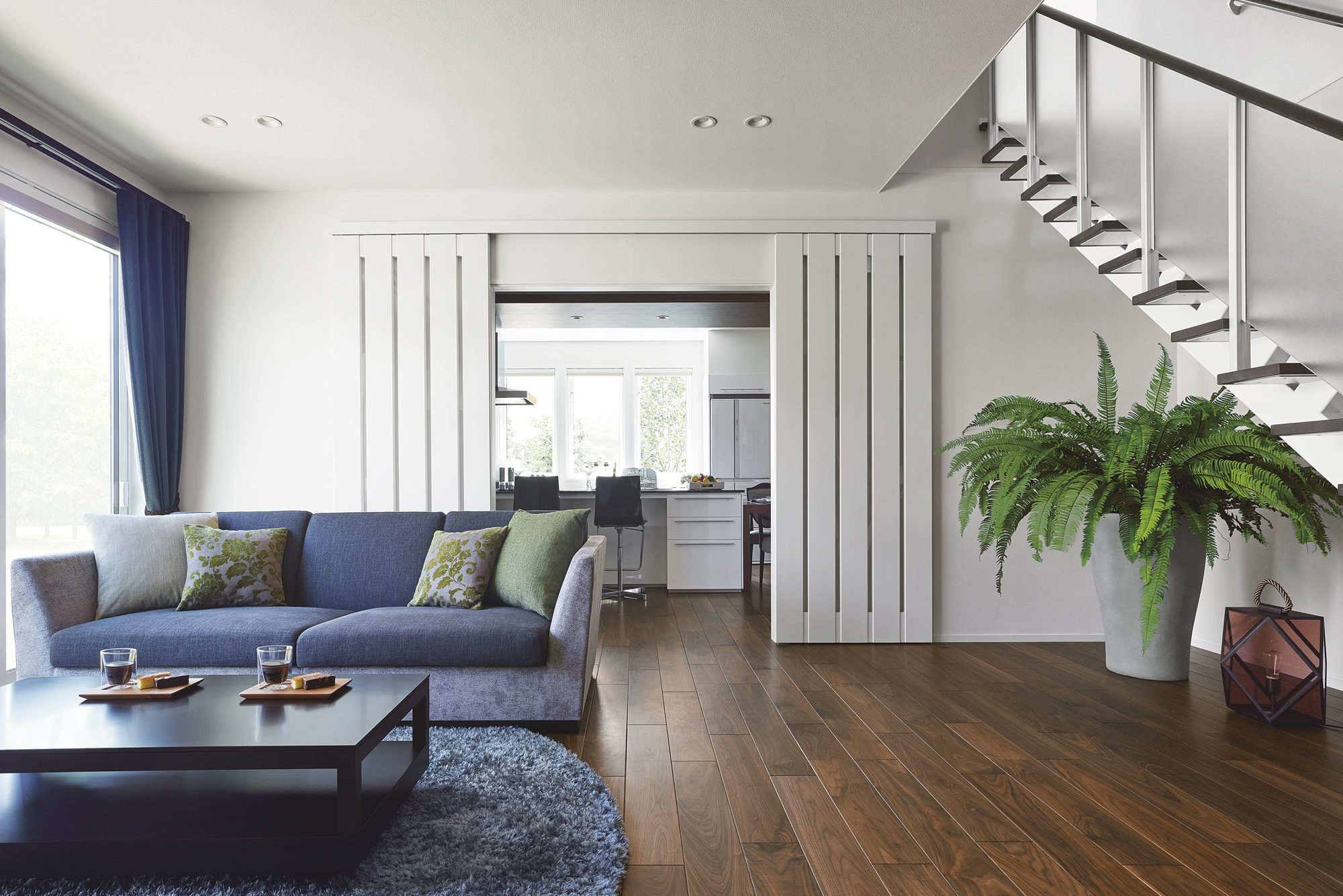 ウォールナット床材でモダンかつ上品な空間に。外出したくなくなるようなお住まいをご提案致します。