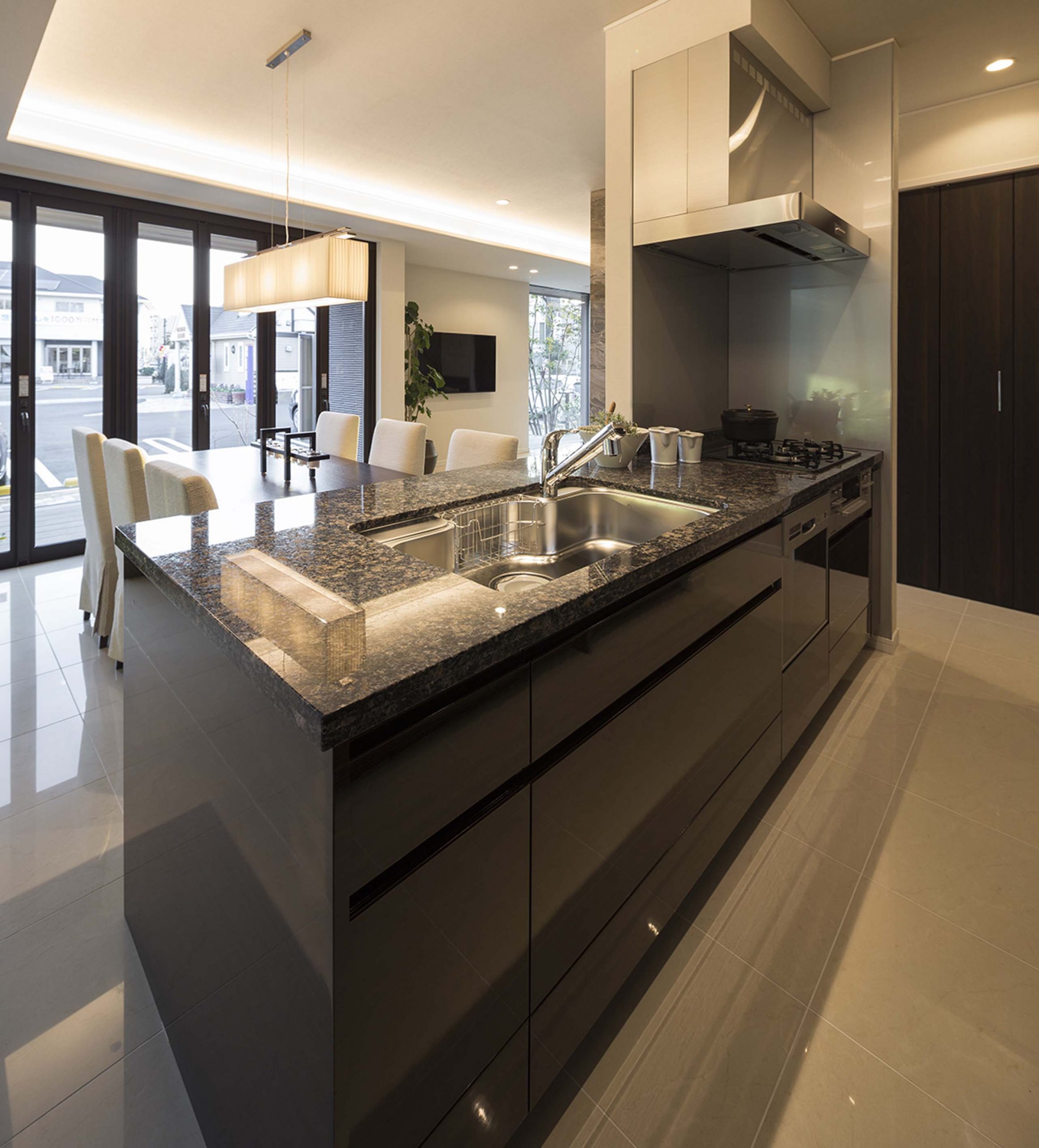 高級ブランド『KitchenHouse』仕様(奥様必見)。家の中心に計画し、生活ゾーンを見渡せます。