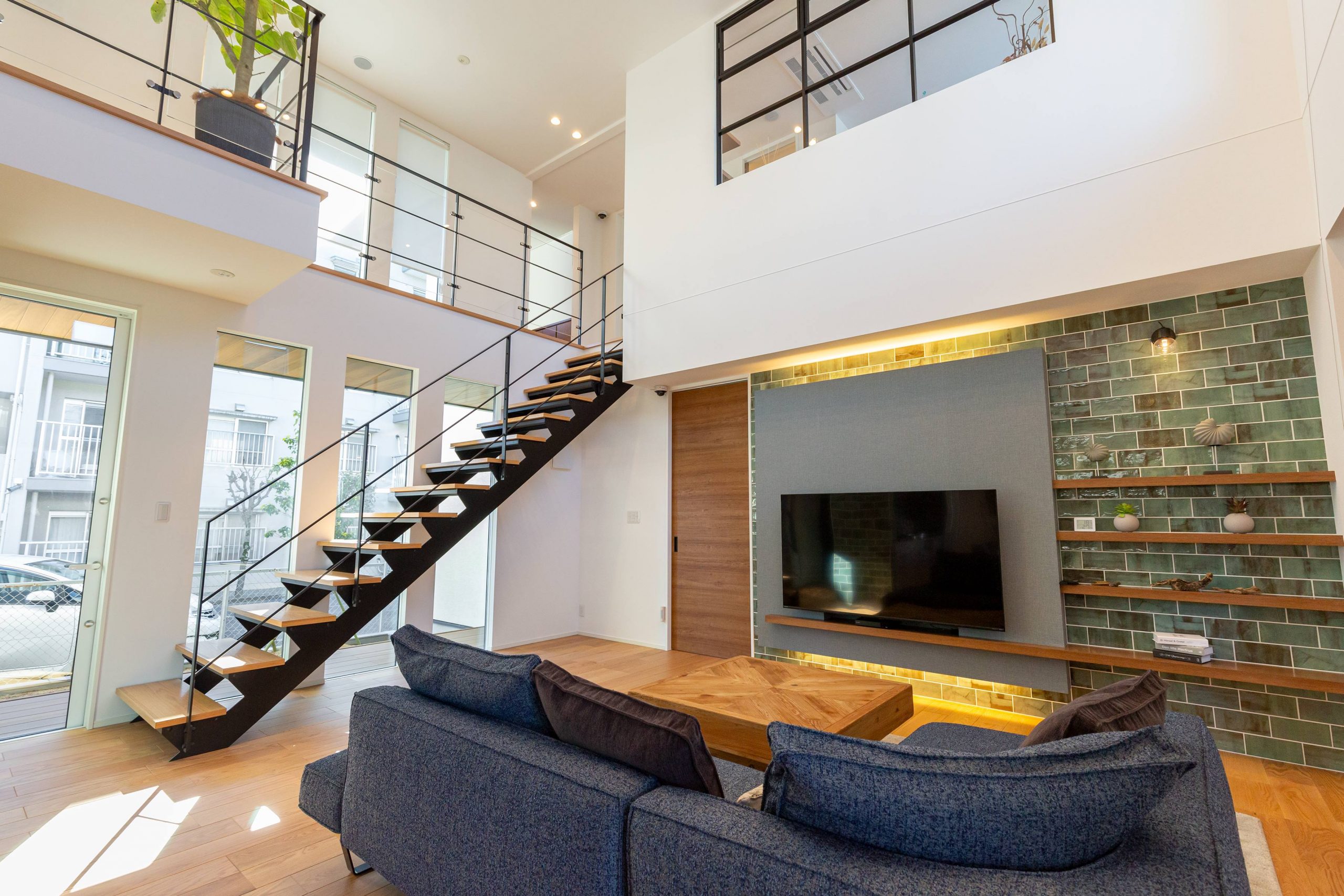 2色のタイルを組み合わせた立体感のあるモダンな外観。縦長窓がリズミカルに連なり、外観の美しさを際立たせています。1Fは、廊下を無くし、階段をリビングの中に設置。ほぼLDKという、開放的な空間を実現しました。2Fには、近隣からの視線を遮りつつ外空間を満喫できるルーフガーデンを備え、開放的な住まいをご提案しています。