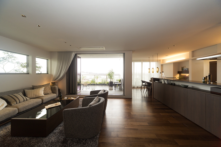 高級感のあるアジアンテイストでコーディネートしたインテリア空間は、内と外を繋ぐフルオープンサッシや壁面意匠を活かしリゾートの開放感と寛ぎを創出。