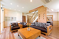 無垢フローリング・木の素材、吹抜・大開口サッシは心地良い開放的な空間。