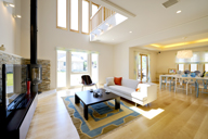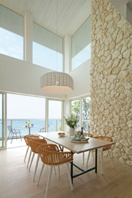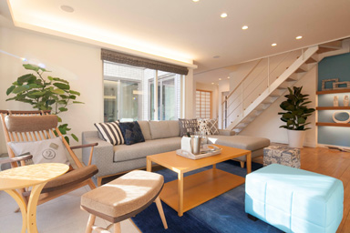 吹抜けとコーナーサッシが大空間を演出。 海や空と一体になる爽やかな開放感が、くつろぎをもたらします。