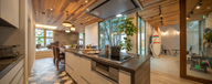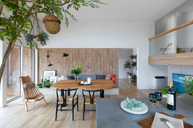 天井高3.4m大空間設計。自然を感じながら料理や食事を楽しむ二世帯の集いの場。