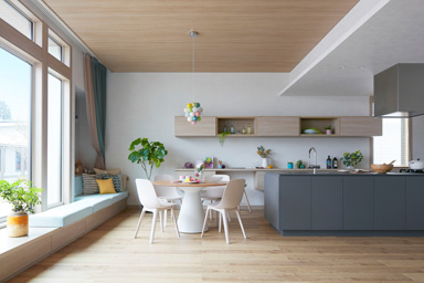 無柱で実現できる大空間リビングは、家族が自然と集まる場所。年齢と共に変化するライフスタイルに柔軟に対応できるよう設計しております。水回りを始めとした、主婦目線を意識した家事動線も見どころの一つ。キッチンはLD全体が見渡せ、自然と家族の会話が増える空間となっております。頻発する災害から家族を守るシェルターとして、災害に強いのは勿論の事、災害時に活躍する最新設備も見所です。