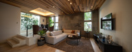 ナチュラルな板張り天井に天然石・レザーの素材感を加えたシックなリビング。
