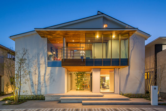 敷地に対し、最大限に空間を活用できるようにしたスキップフロアのある2階建ての住宅です。室内は、ハーフ吹き抜けや、大収納、ロフト等により空間が立体的に活用でき見所が満載です。太陽光やIOT、全館空調等の最新設備を設置した、ZEH住宅。また、日本古来の知恵を多く取り入れ、深い軒先や、土間空間として使うセカンドリビング等新しい住まい方提案も見所の一つです。
