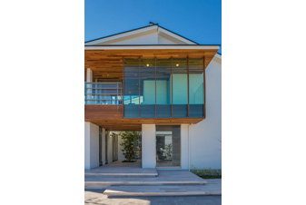 - ガラスと木製リブの異素材マリオンが印象的なファサード。