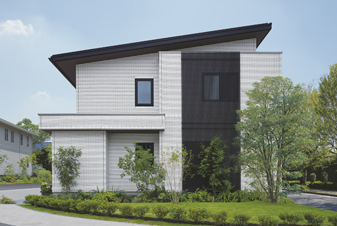おおらかな片流れにキューブデザインを組み合わせたシンプルなフォルム。自然素材の風合いを感じさせる木目調タイルと塗り壁のデザイン。大きな屋根面積によりZEHやLCCMを達成しており、エネルギー面も充実。