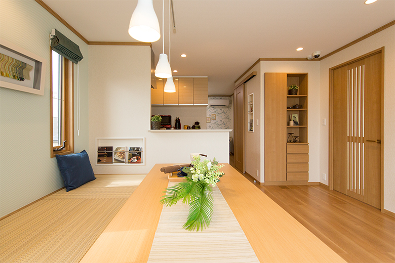 シンプルモダンの空間に溶け込む、落ち着いた色調の和室。床の間を備えた本格仕様。