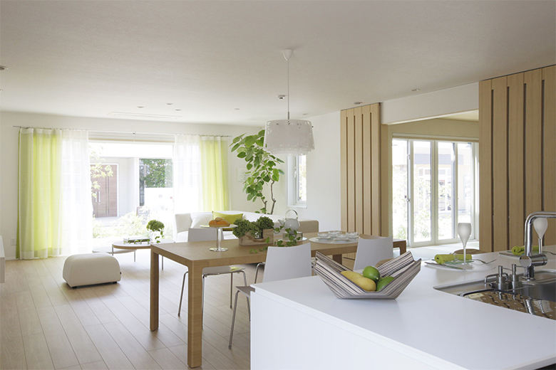 玄関からダイニングの窓まで視線が抜け、大開口からたくさんの光が入ってきて空間の広がりが感じられるLDK。