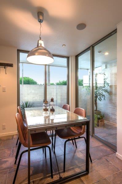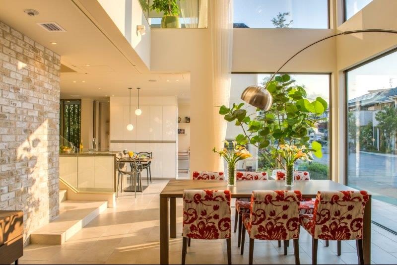 大開口の吹抜けから明るい光が差し込むダイニング。内から外へ繋がるキャンティの床は広さを強調