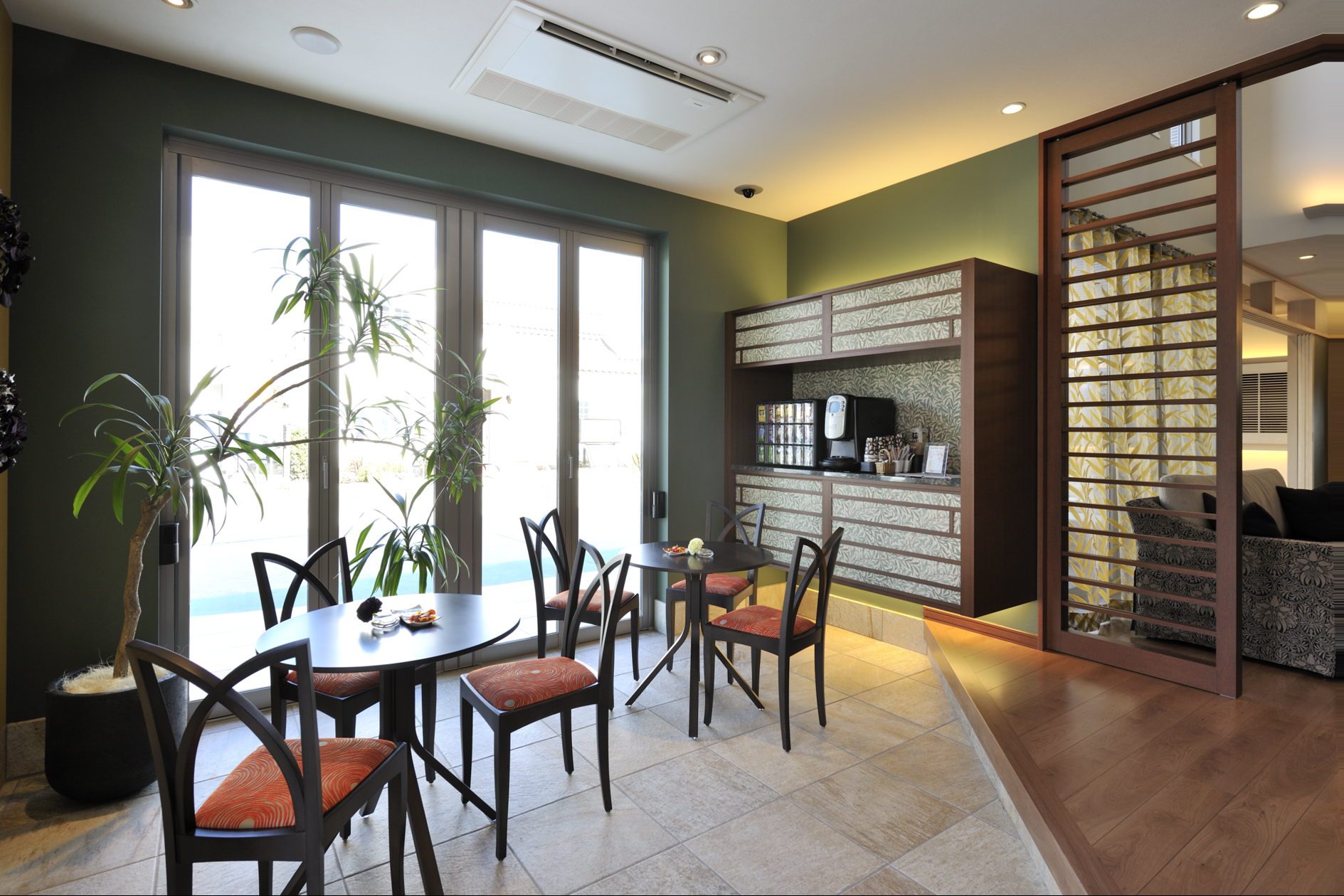 カフェスペースを設け、おいしいコーヒーでお客様へのおもてなしの場になっている土間。