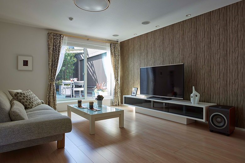 内から外への広がりを感じられるリビング。アクセントクロスがシンプルな室内を引き締めています。