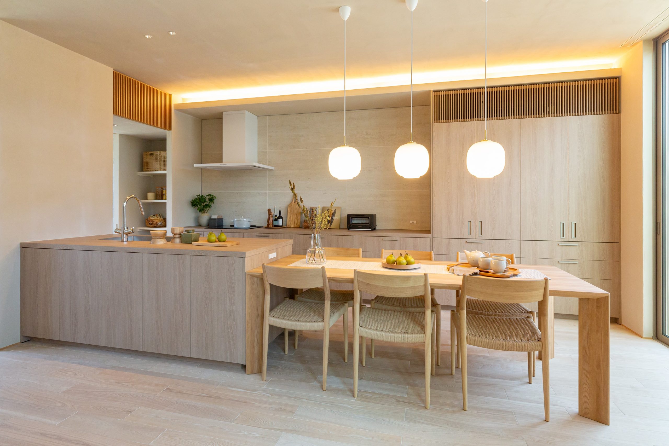 明るい木素材のテイストの2Fキッチン。さわやかな光に包まれてお料理のテンションも上がります。