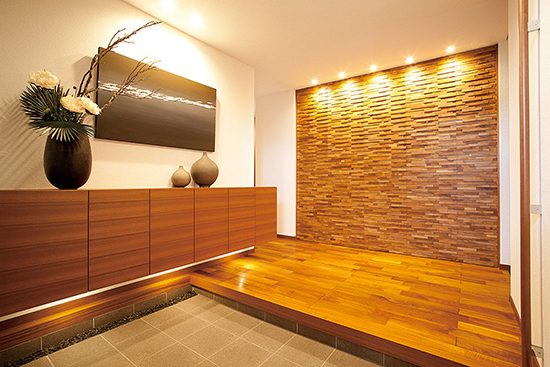 玄関:世界三大銘木「チーク」で樹種コーディネートされた上質の空間をご体感下さい!!
