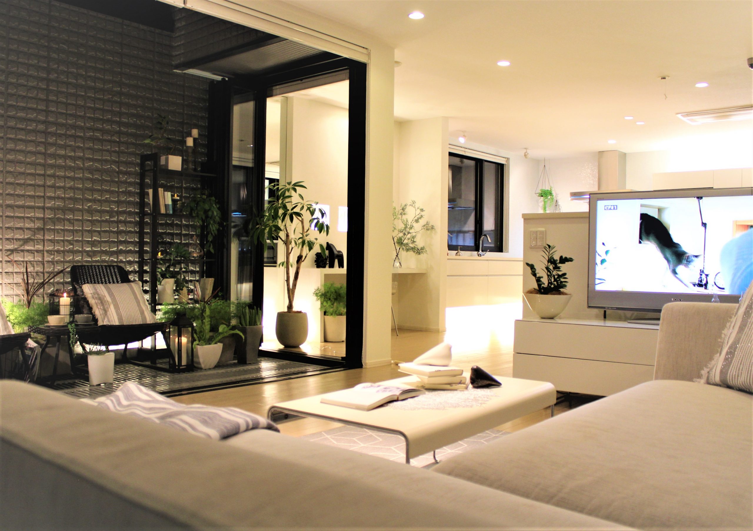 シンプルで無駄のないインテリアとアウトドアリビングの調和がご覧いただけます。