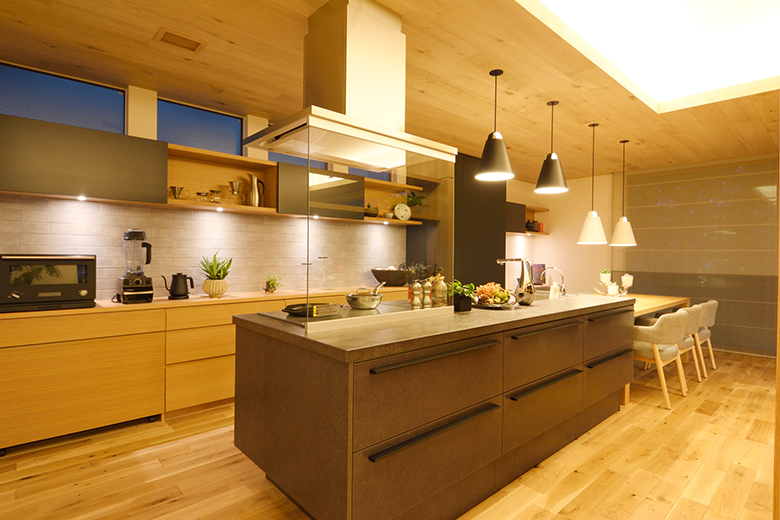 ダイニングからつながるリビングはダウンフロアを採用し大空間を演出しています。 またキッチン裏に洗面スペースを設け、水まわりをまとめた家事動線や、パントリー・小屋裏収納などの豊富な収納スペースも魅力です。