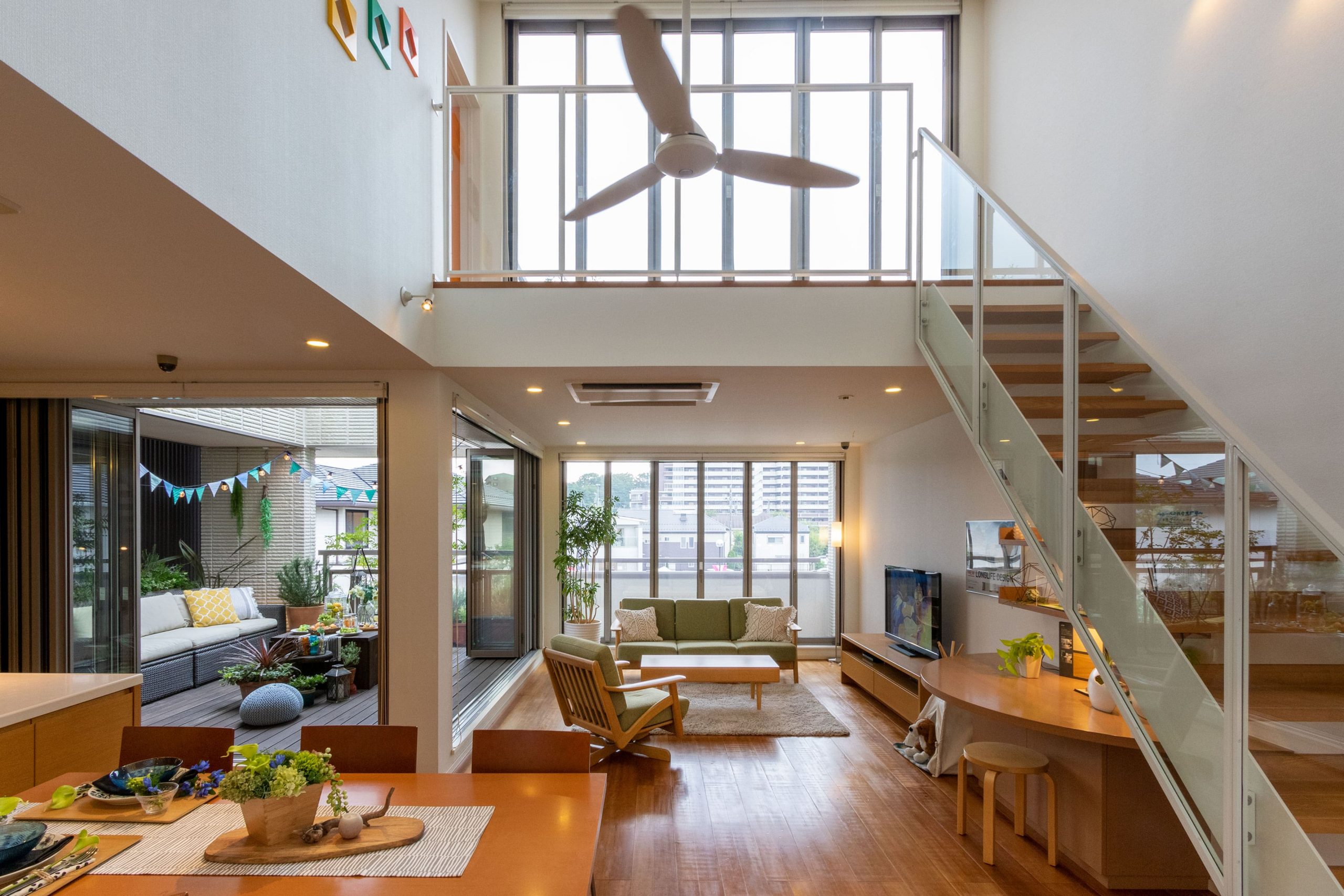鉄骨ならではの大空間+全面窓+吹抜けの三位一体!家族が笑顔になるリビングです♪