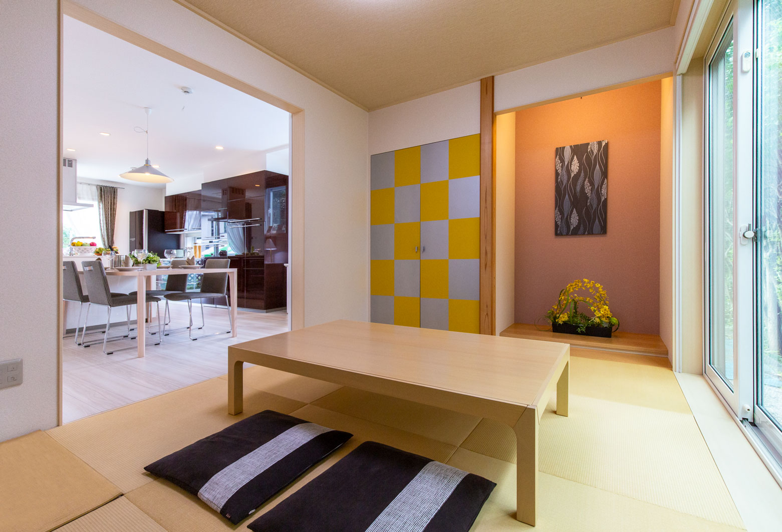 モダンなスタイルに仕立てられた和室。市松模様の襖が印象的です。