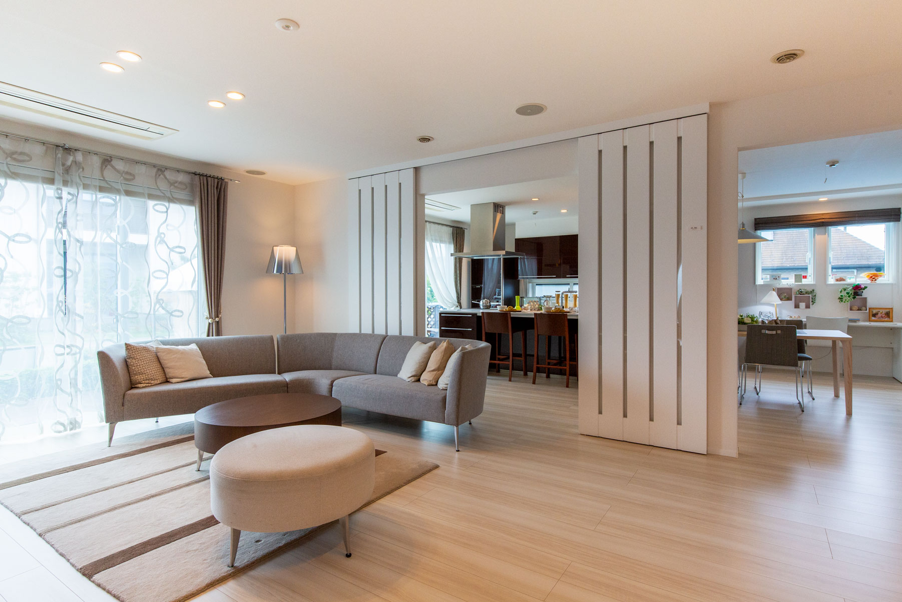 キッチン・ダイニングと程よく仕切ったリビング。スリット建具が室内にアクセントを添えています。